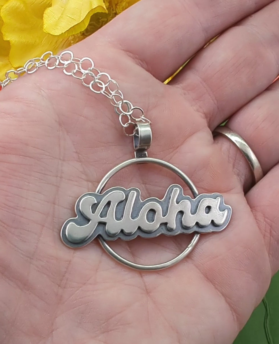 Alooooooha!!! Aloha is the Hawaiian word for love, affection, peace, compassion and mercy, that is commonly used as a greeting. Why not carry that feeling with you whereever you go?! Well, now you can with this meticulously handmade Aloha necklace!