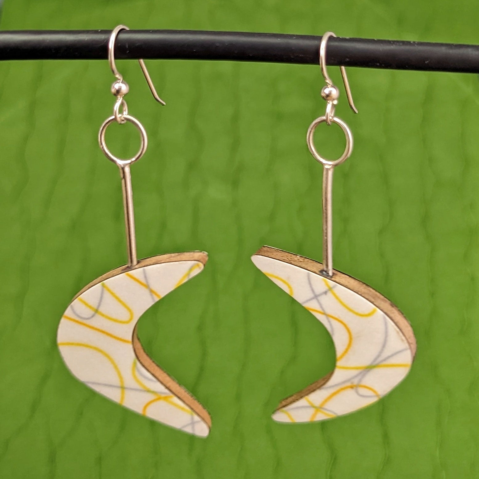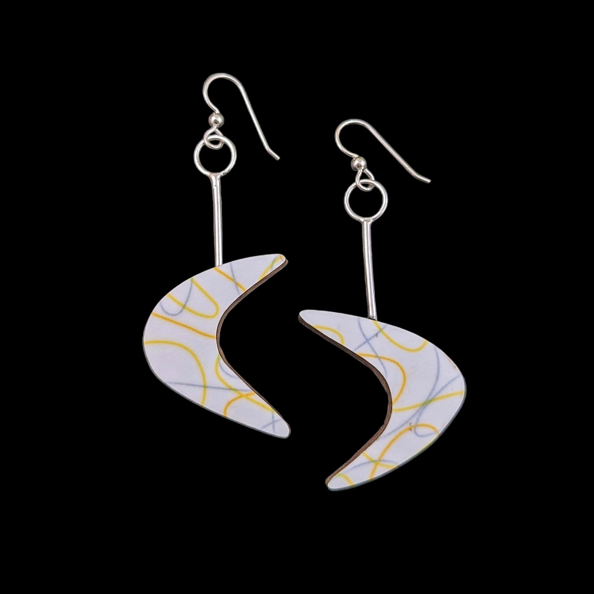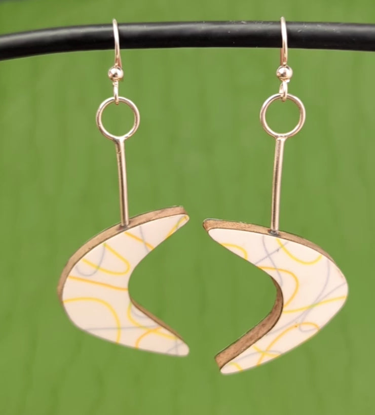 - Back of earrings are covered with a laminate chosen to complement the boomerang pattern